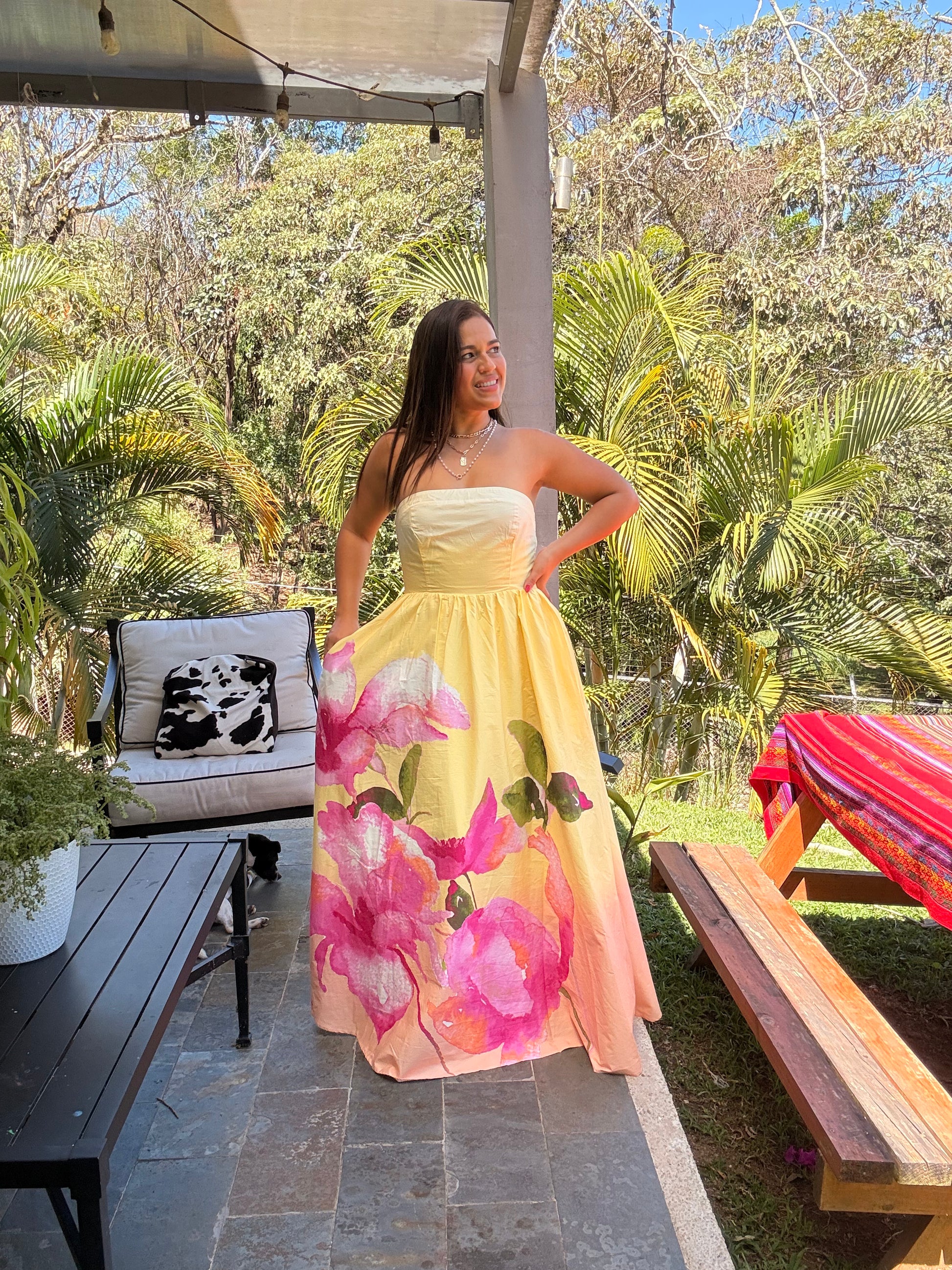 Un hermoso vestido floral strapless con nido de abeja en la espalda y goma en busco para que no se baje. Simplemente espectacular.